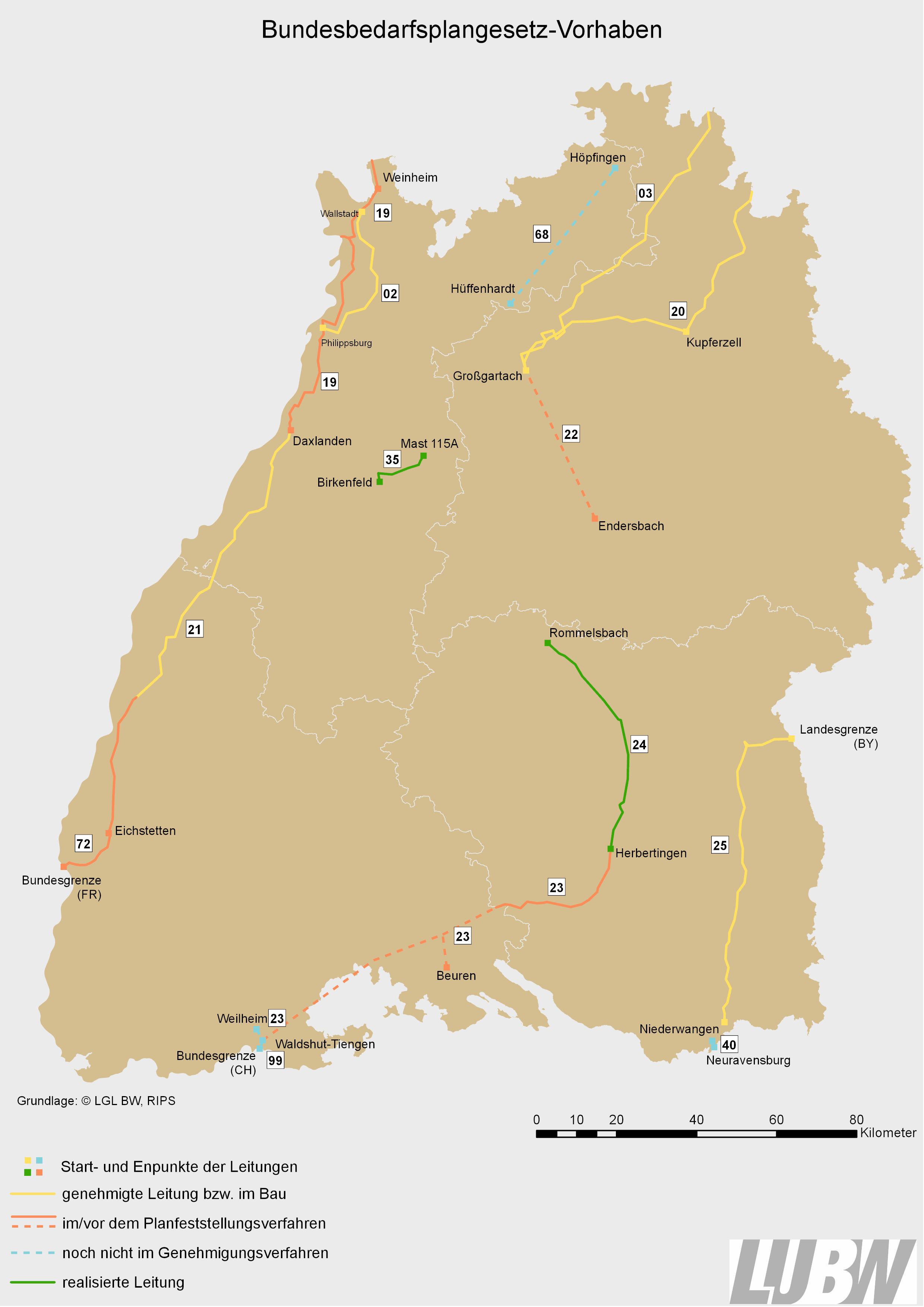 Das Bundesbedarfsplangesetz umfasst rund 100 energiewirtschaftlich notwendige Leitungsbauvorhaben, 14 davon – zum Teil landesübergreifend – in Baden-Württemberg.
